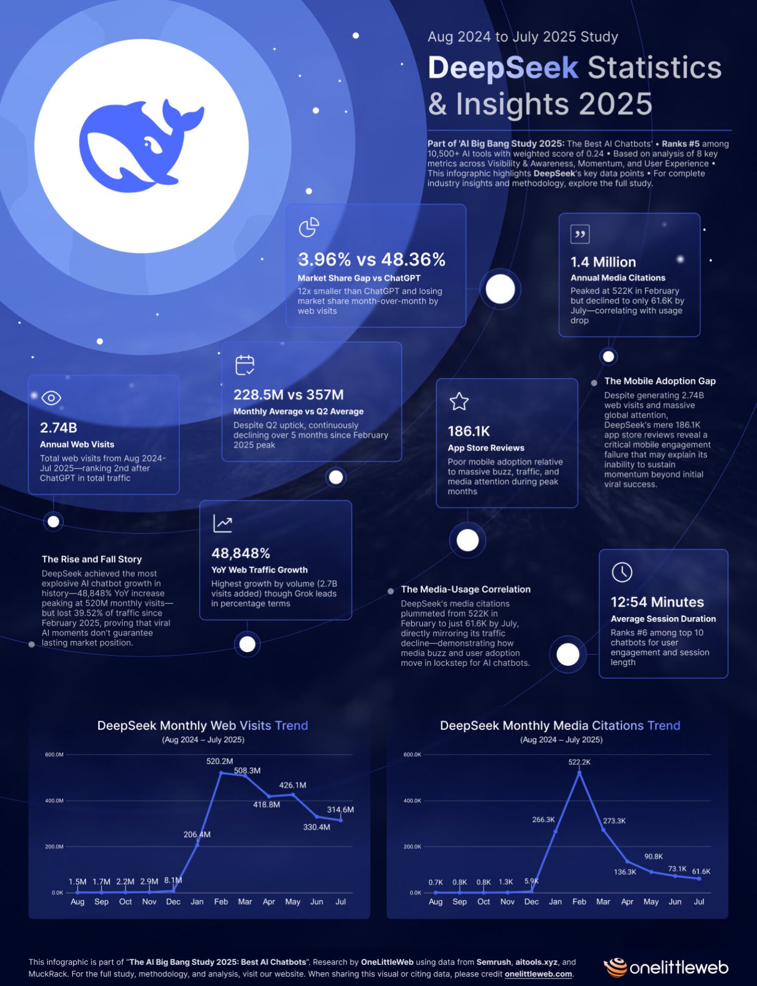The infographic’s dramatic peak-and-valley pattern tells DeepSeek’s complete story. The explosive growth curve shows it could break into a crowded market and capture serious attention, driven by strong performance in Chinese markets and rapid model development.