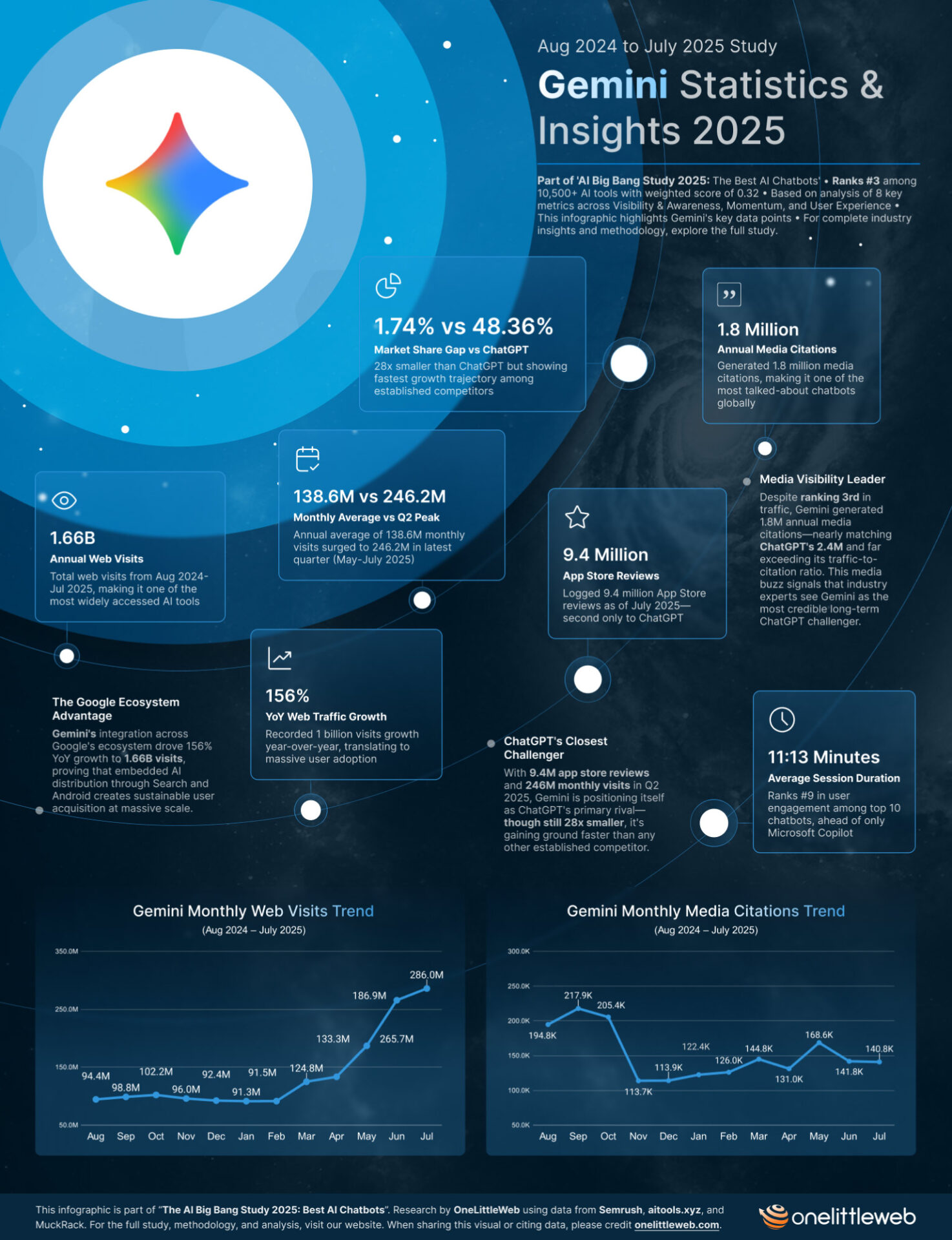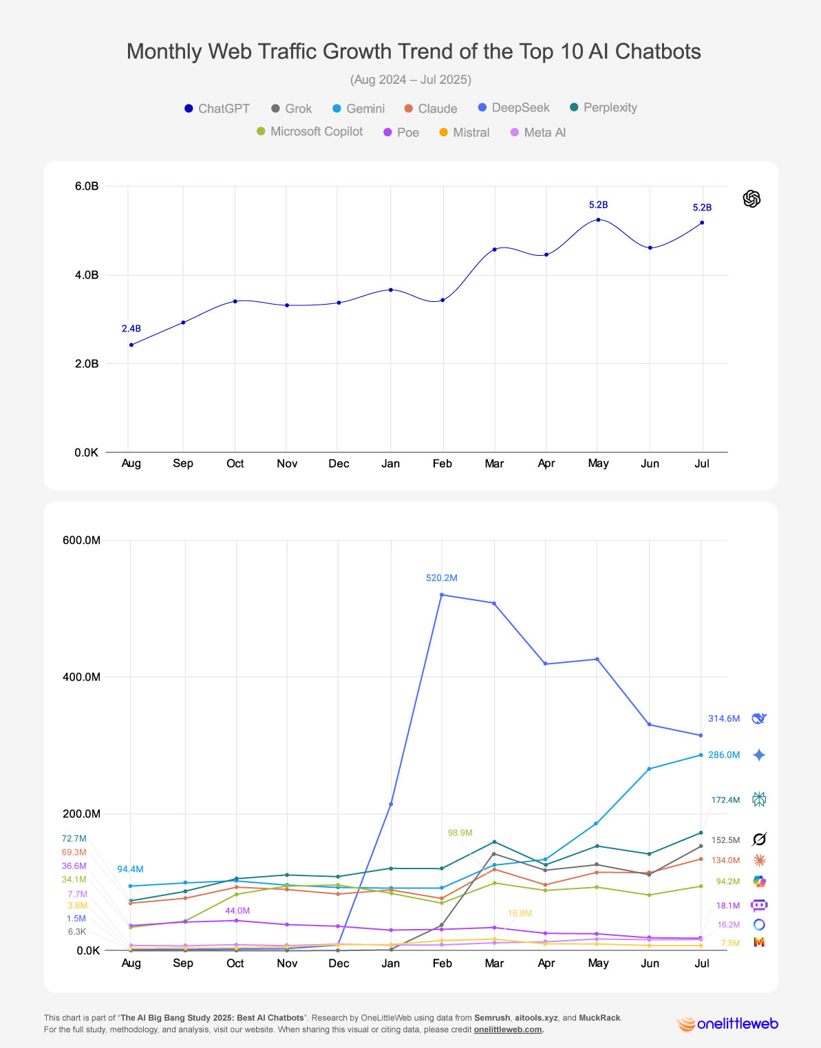 Google’s Gemini is the steady climber to watch. With 156% growth and 1.66 billion visits, it’s methodically building the foundation to challenge ChatGPT’s dominance. Its recent acceleration to 246 million monthly visits suggests the race for #2 is far from over.