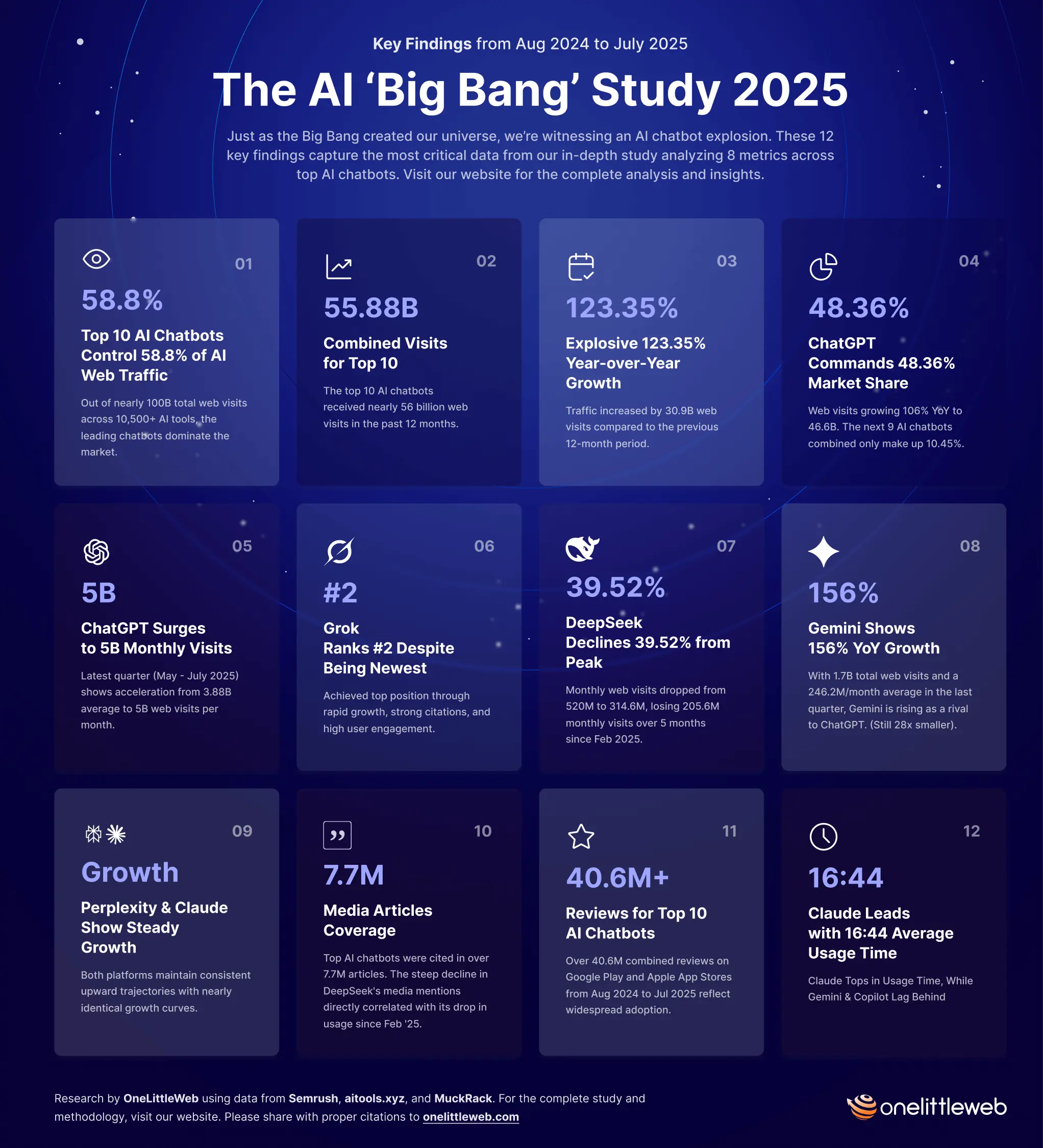 After analyzing 55.88 billion visits across the top 10 AI chatbots over 12 months, one thing is clear: we’re witnessing a genuine AI chatbot “Big Bang” — but the winners aren’t necessarily who you’d expect.