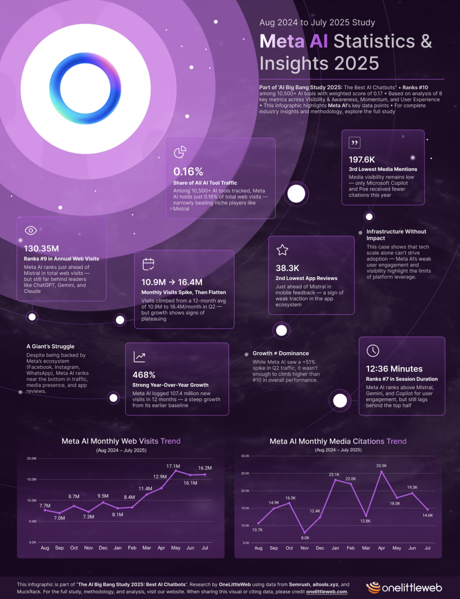 Meta AI’s underperformance highlights a mismatch between resources and real-world impact. While Meta has the infrastructure, funding, and platforms (Facebook, Instagram, WhatsApp) to scale any product overnight, its AI assistant has struggled to generate buzz or user loyalty.