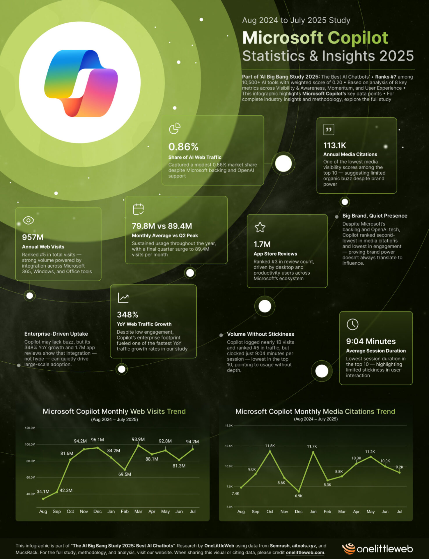 Microsoft Copilot takes the #7 spot in our 2025 rankings, showing exceptional growth across enterprise-facing use cases. Over the 12-month period, it surged in web visibility and app reviews — driven largely by its seamless integration across Microsoft 365 and Windows platforms.