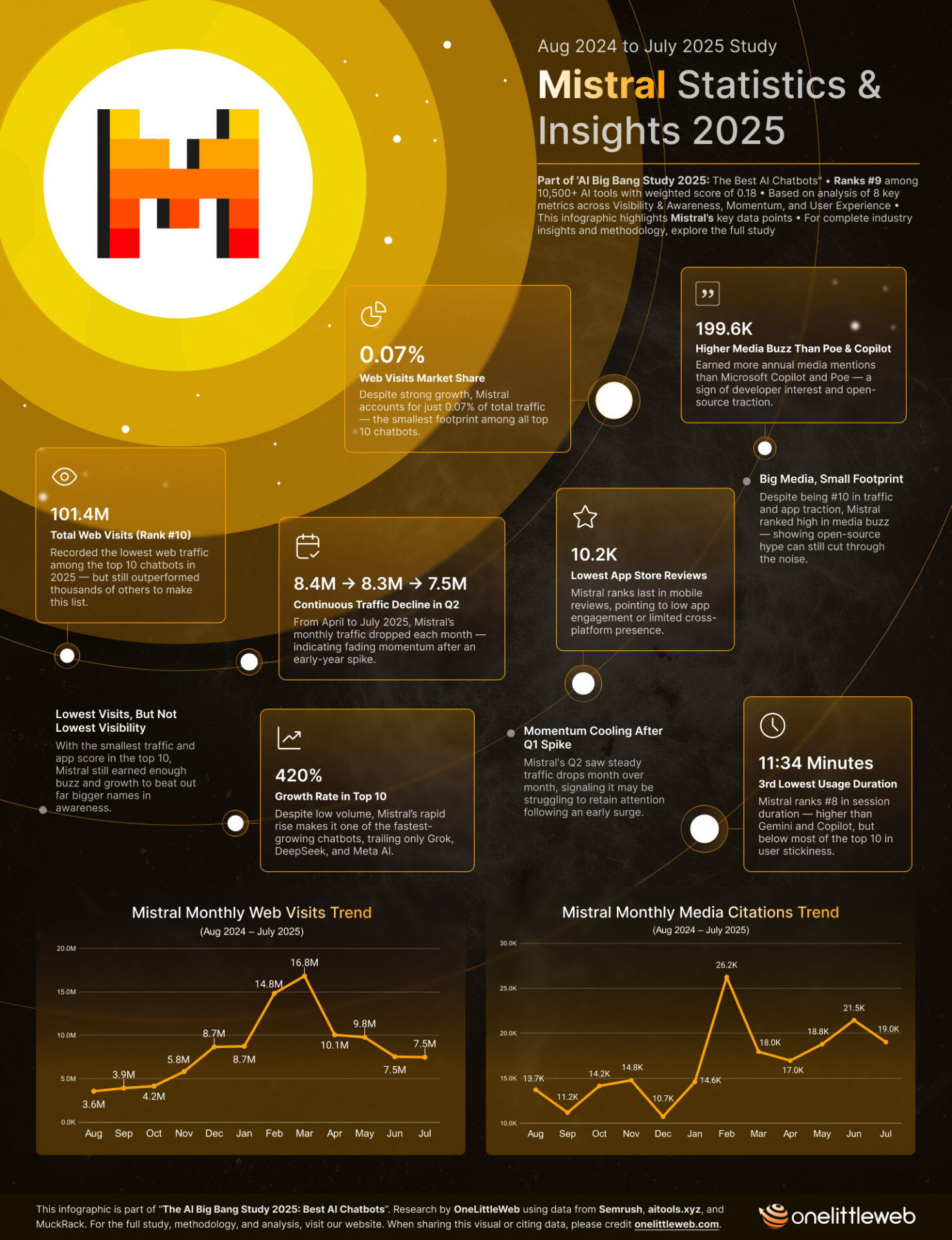 The infographic’s growth acceleration curve reveals Mistral’s developer-first strategy paying off. While the market share visualization shows a tiny slice, the media coverage comparison demonstrates outsized attention relative to user base — indicating strong thought leadership in the open-source AI community.