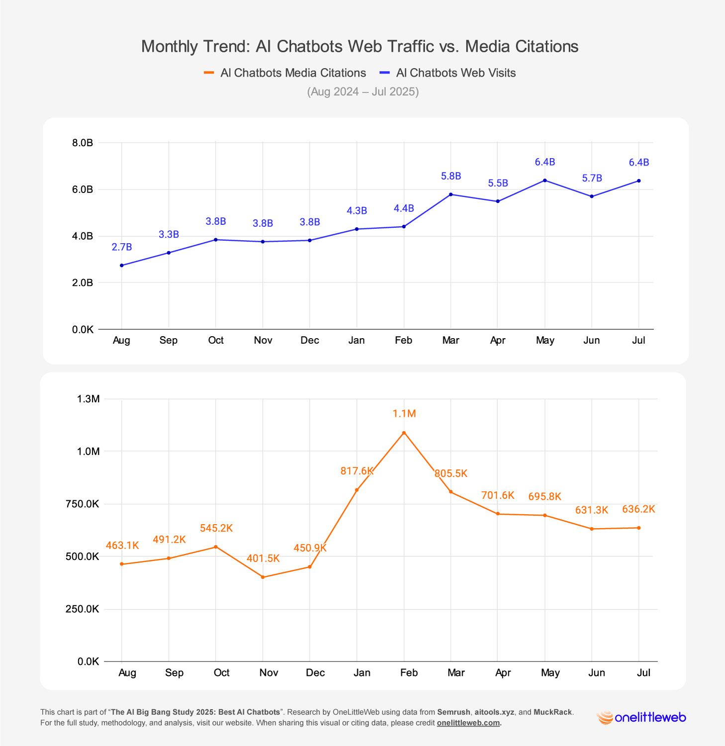 Data on media citations vs chatbot growth, year-over-year visits comparison, and analysis of which chatbots are gaining or falling behind.
