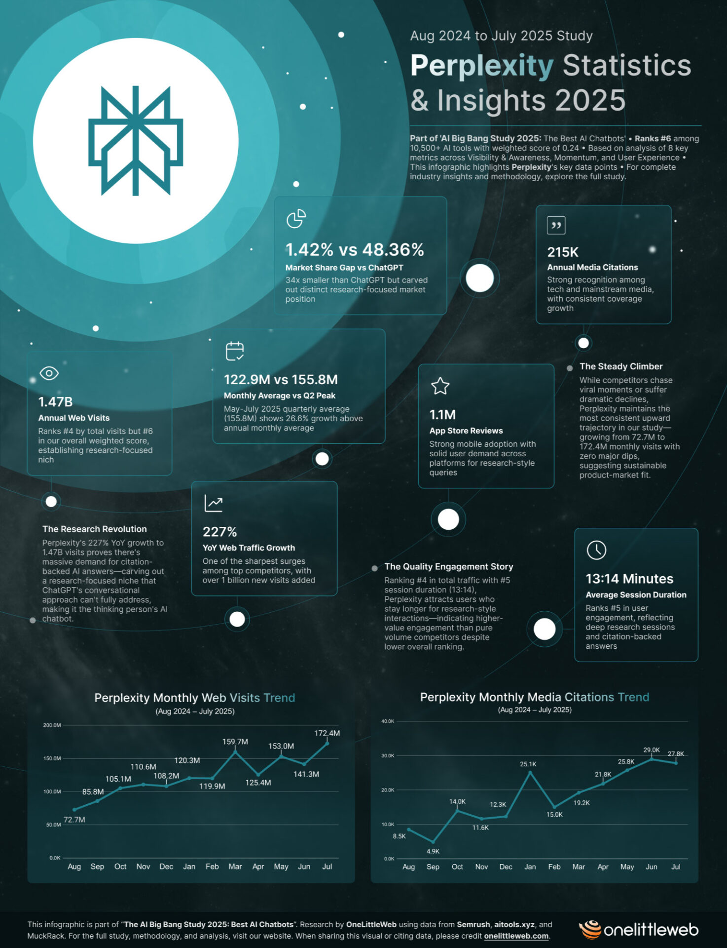 Between August 2024 to July 2025, it steadily grew across web visits, engagement, and recognition — positioning itself as a favorite among users who prefer factual, citation-backed answers over conversational fluff.