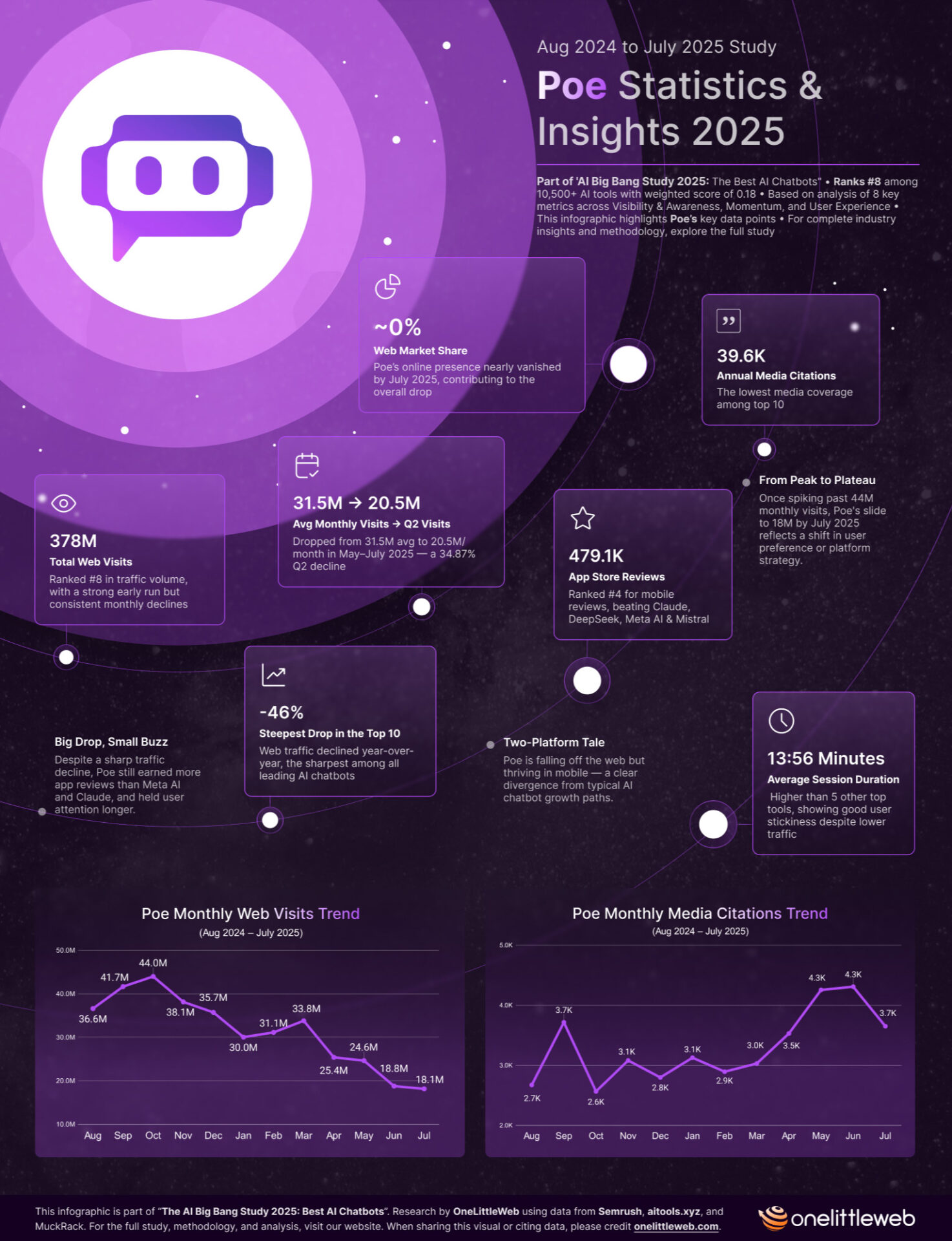 Poe ranks #8 in our 2025 study — not for its web dominance, but for its surprisingly strong footprint in the mobile app ecosystem. Built by Quora, Poe once surged with momentum in earlier months but has since seen a steep drop in web visibility. Still, it maintains relevance thanks to strong app reviews and above-average user engagement time.