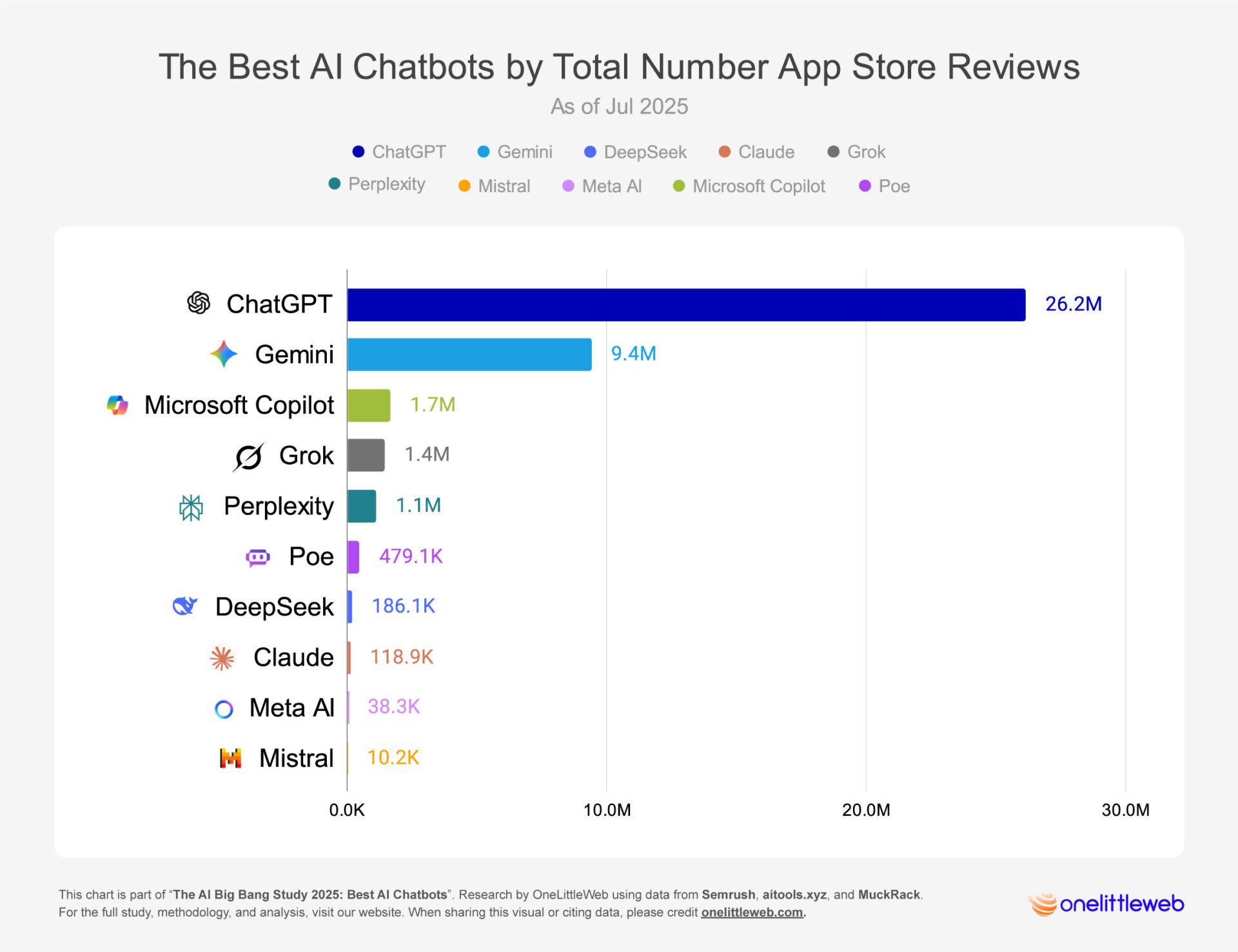 App store reviews act as a proxy for mobile adoption and user sentiment. ChatGPT’s 26.2M reviews confirm its mainstream reach. Gemini, with 9.4M, is a strong mobile-first contender, while Copilot, Grok, and Perplexity form a tight mid-tier. DeepSeek’s relatively low number may hint at lower mobile stickiness.
