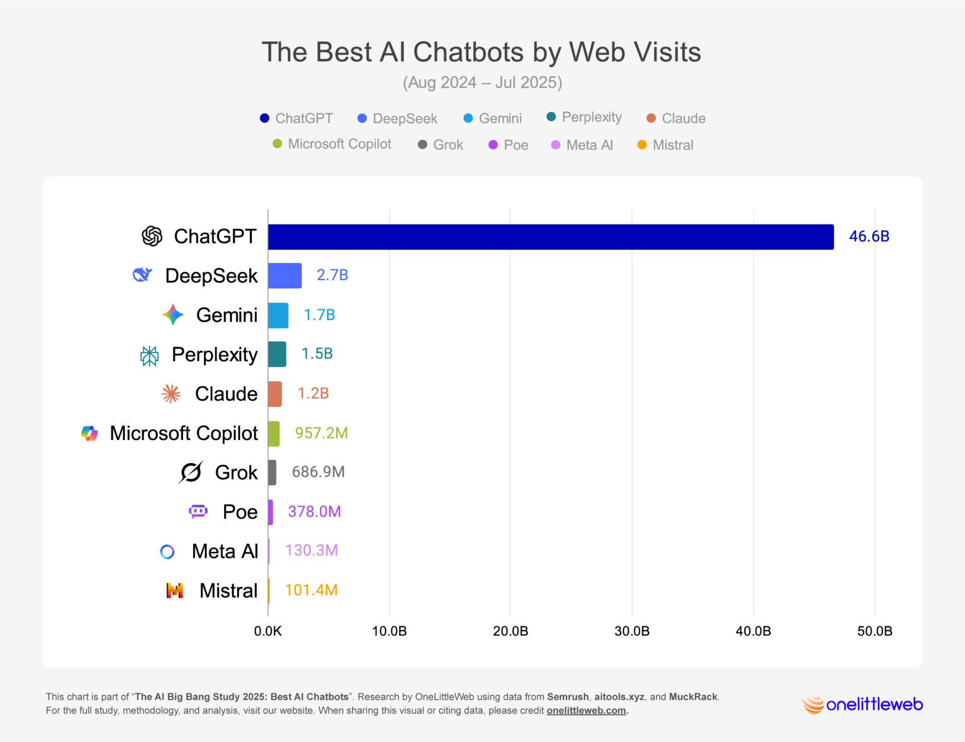 Together, these 10 chatbots account for 58.8% of all AI web traffic — proving that in this fast-expanding AI universe, a small group of platforms now dominate the orbit of user attention.