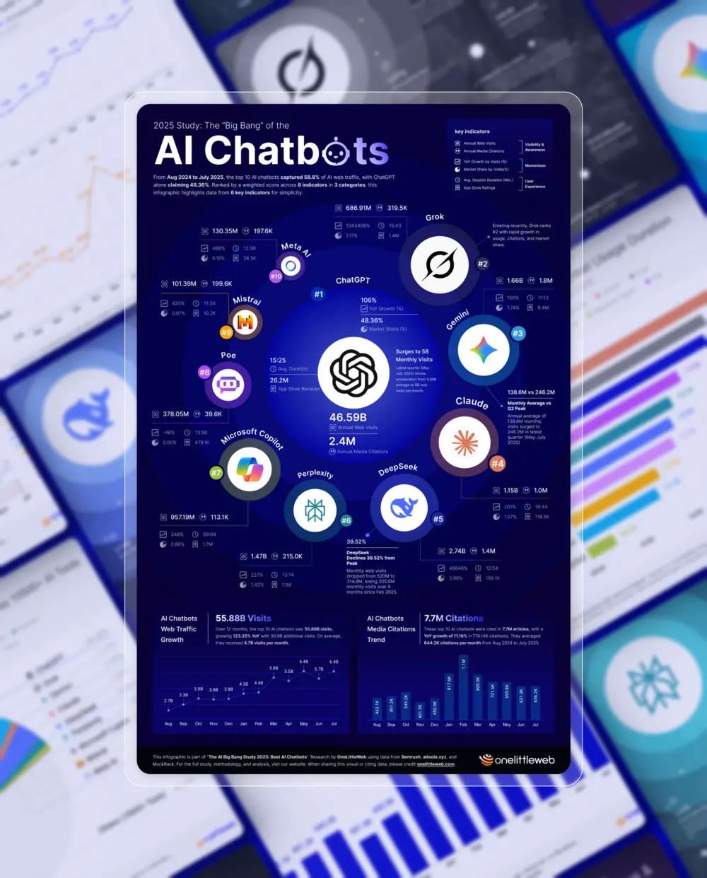 A 12-month analysis (Aug 2024 – Jul 2025) of the top AI chatbots, using trusted data from Semrush, MuckRack, AITools.xyz, and app stores. Packed with infographics, charts, and trends—covering traffic, growth, engagement, and market share.