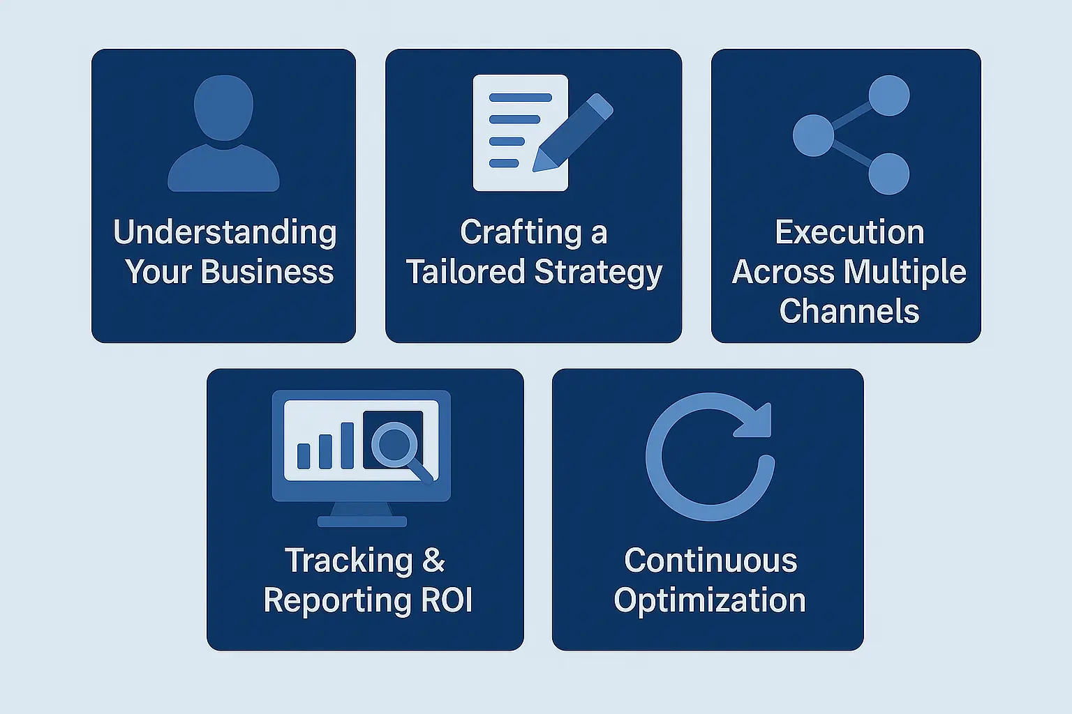 Agencies start by learning about your goals, audience, and competitive landscape. For small businesses, this often means focusing on local visibility, building credibility, and driving steady leads.