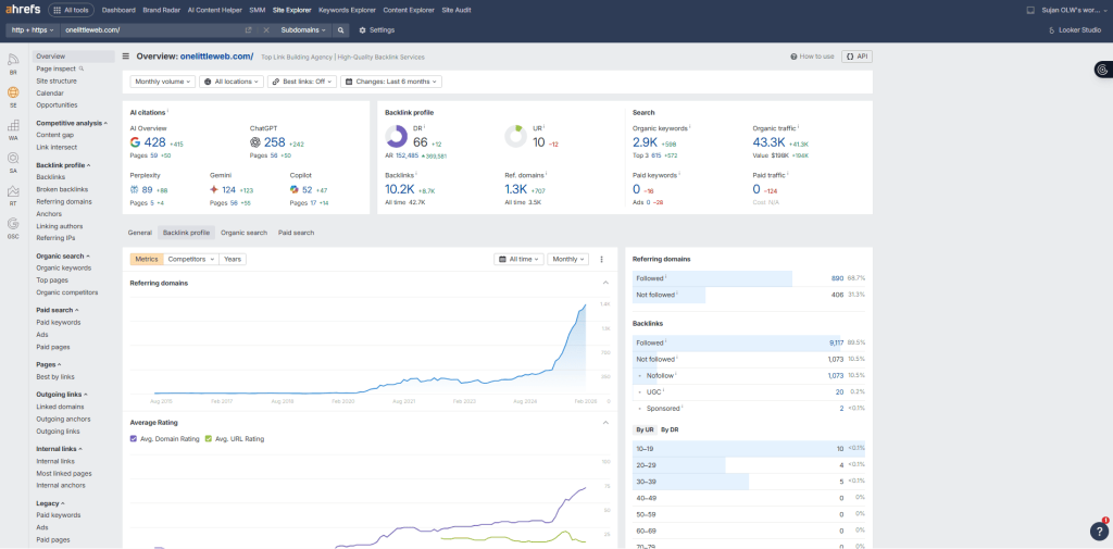 For link building specifically, this is where I start every single campaign. Site Explorer lets you plug in any domain and instantly see every backlink, referring domain, anchor text pattern, and link growth trend.