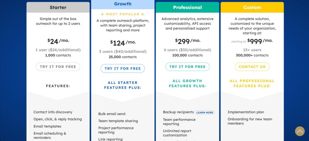 User sentiment: Respona earns the highest user ratings of any outreach tool on this list. Reviewers consistently praise the AI personalization quality, the content-first prospecting approach, and the support team’s responsiveness.
