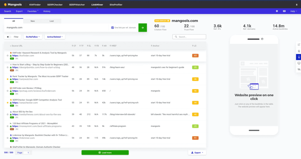 Mangools (LinkMiner) gives you backlink analysis, keyword research, and rank tracking in one clean interface that anyone can learn quickly. It’s the simplest way to start building links without feeling overwhelmed by complex dashboards or enterprise features.