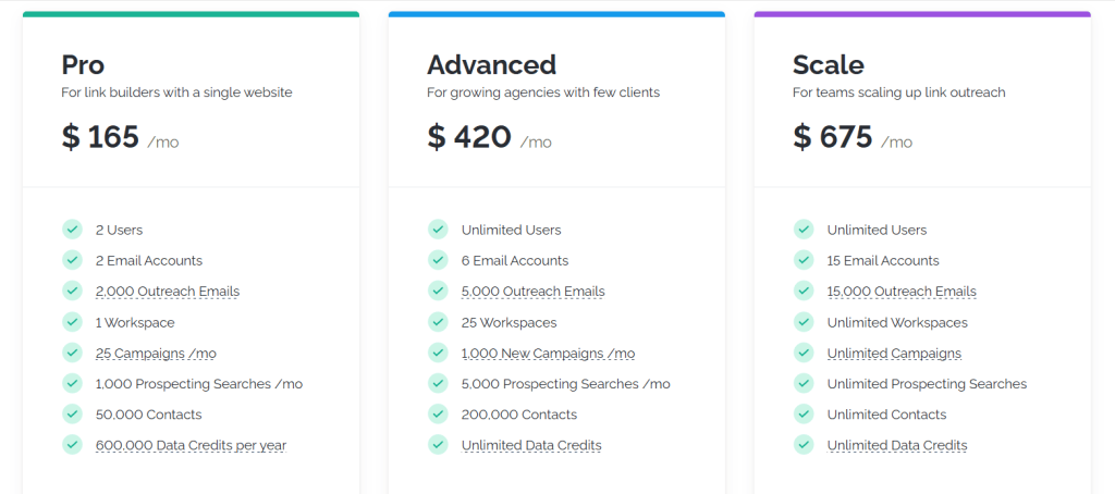 - No SEO Metrics: Lacks backlink data, authority metrics, and prospect qualification tools.