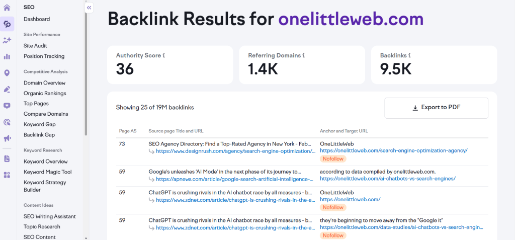 Semrush covers backlink research, competitor analysis, outreach, and link monitoring inside one platform with 55+ tools included. At OLW, we use it as the backbone for most client campaigns because it handles everything from research to reporting.