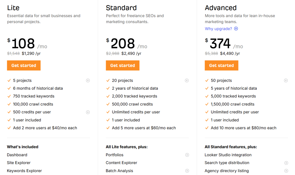 At the entry level, Ahrefs Lite at $108/month and Semrush One Starter at $165.17/month are similarly priced, but Semrush gives you more at that tier.