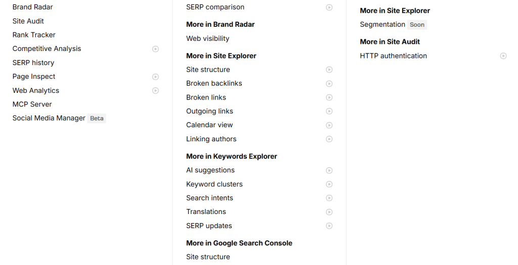 Includes access to Site Explorer, Keywords Explorer, Site Audit, Rank Tracker, Competitive Analysis, Brand Radar, Web Analytics, and more.