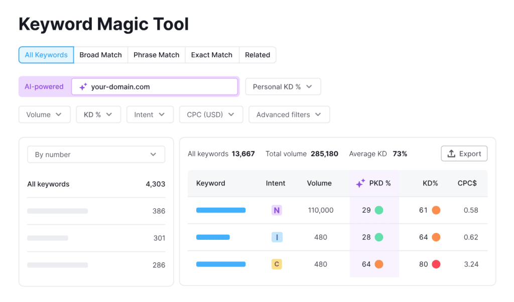- Best-in-Class Keyword Research: The Keyword Magic Tool surfaces thousands of keyword variations with search intent, difficulty, and trend data all in one view.